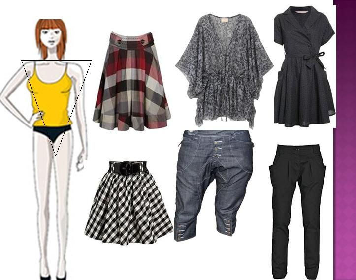 Triangulo invertido - Procure usar blusas de tecidos molengas, cores neutras e decotes estreitos e profundos para dar leveza ao tronco. Para destacar os quadris, prefira peças estampadas, bolsos ou detalhes chamativos nessa região. E lembre-se de que, com saias, vestidos e bermudas, suas pernas bonitas ganham destaque. Pode escolher também sapatos incríveis para tirar a atenção do ombro.