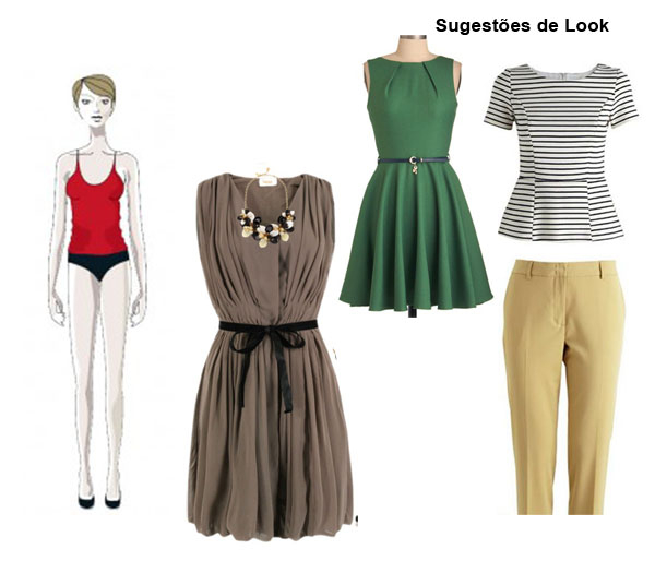 Vamos às dicas Retângulo - Os cintos e faixas ajudam a criar uma falsa cintura. Blusas soltas são ótimas escolhas para esconder a falta de curvas. Você pode valorizar a região do colo com decotes, colares ou detalhes de modelagem, como babados e pregas. A ideia pode ser desviar os olhares de suas formas retas. Aumente os quadris usando saias evasês e calças com bolsos volumosos. Isso é ótimo, pois cria um contraste com a cintura, fazendo-a parecer mais fina.