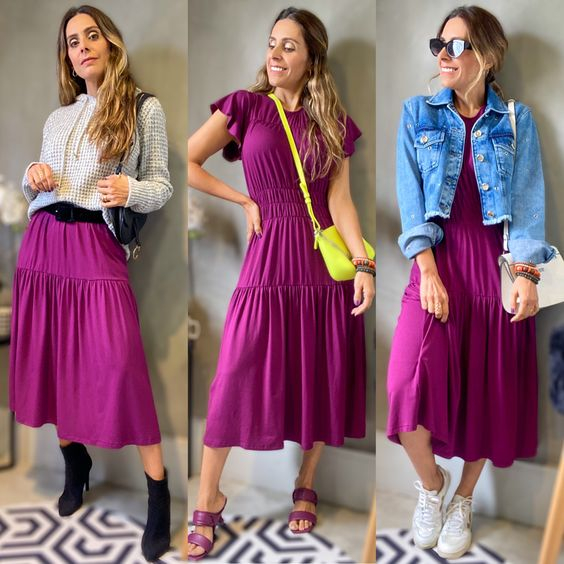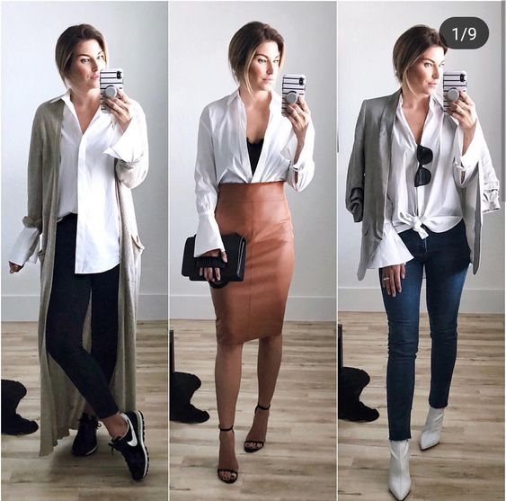 Sabe qual é o pulo do gato para usar bem as peças que tem? Tentar usar a mesma peça em ambientes diferentes, de forma diferente. Por exemplo, uma T-shirt com bermuda num momento bem informal para o dia, e usar essa mesma T-shirt para uma saída mais formalzinha com uma calça de alfaiataria, um saltinho e quem sabe uma terceira peça. Também você pode usar um vestido com uma rasteirinha para os passeios informais e o mesmo vestido com uma terceira peça e um sapato ou sandália. Coloquei nas imagens alguns exemplos para inspirá-las.