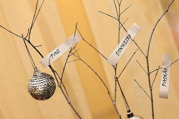 Que tal improvisar uma árvore de galhos secos e colocar bolas na cor prata e enchê-la de papeizinhos com palavras que expressem seus desejos para 2016?