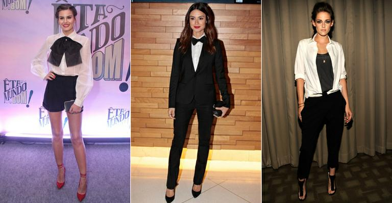 Se seu tipo físico é triângulo (quadril maior que ombros) a opção de look com ar masculino da Camila Queiroz (com essa super borboleta) é a escolha ideal, pois a atenção do look vai toda pra super gravata!